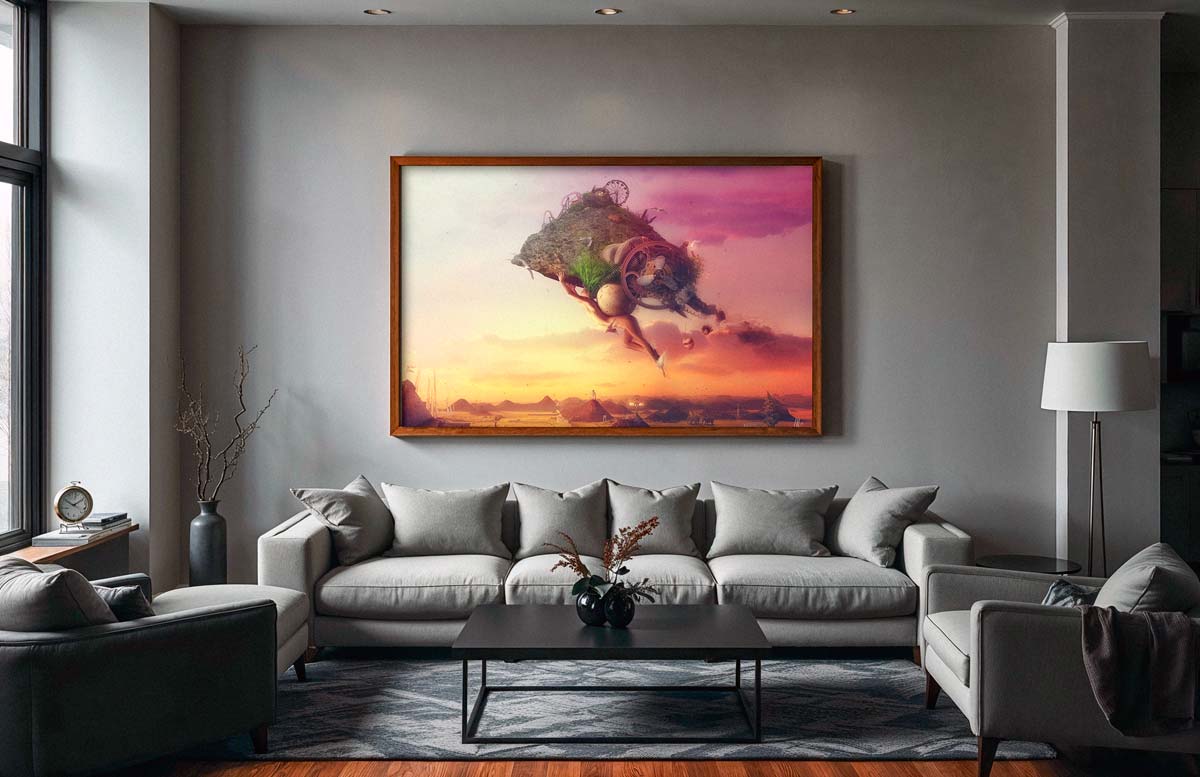 My surreal art prints are available in a variety of high-quality materials, including giclée photo paper, canvas, acrylic, and metal. Each material offers a unique finish, from the classic look of canvas to the modern, glossy appeal of acrylic, perfect for showcasing my colorful surrealism.